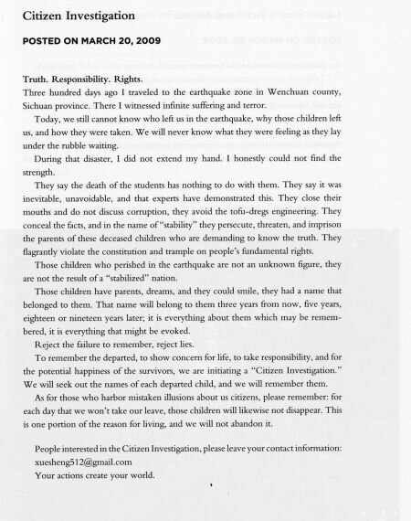 Ai Weiwei began Citizens' Investigation to remember the children who perished in the Sichuan earthquake, and to console the parents who lost them. Besides this act of remembering through an assembled name list of the departed children, he has called upon the government to take responsibility.