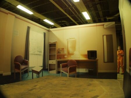 Once the game is over, the participants are asked to stepthroughthe rain curtain - to mark the transition from the virtual to the real world - and proceed along a sand corridor to a reconstructed motel room, where they are confronted with the real identities and experiences of their targets.