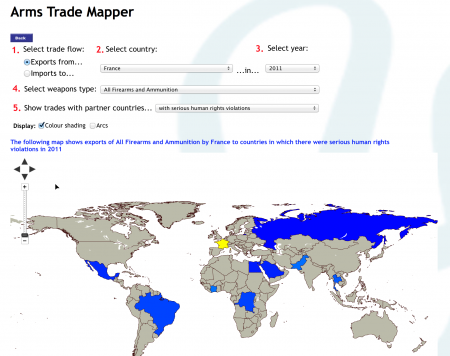 The underlying data draws from over 37 publicly available sources documenting the authorized trade of arms and ammunition, covering 262 states and territories and aggregating over a million data points. Users can explore the interface to map weapons flows by country and year between 1992-2012.